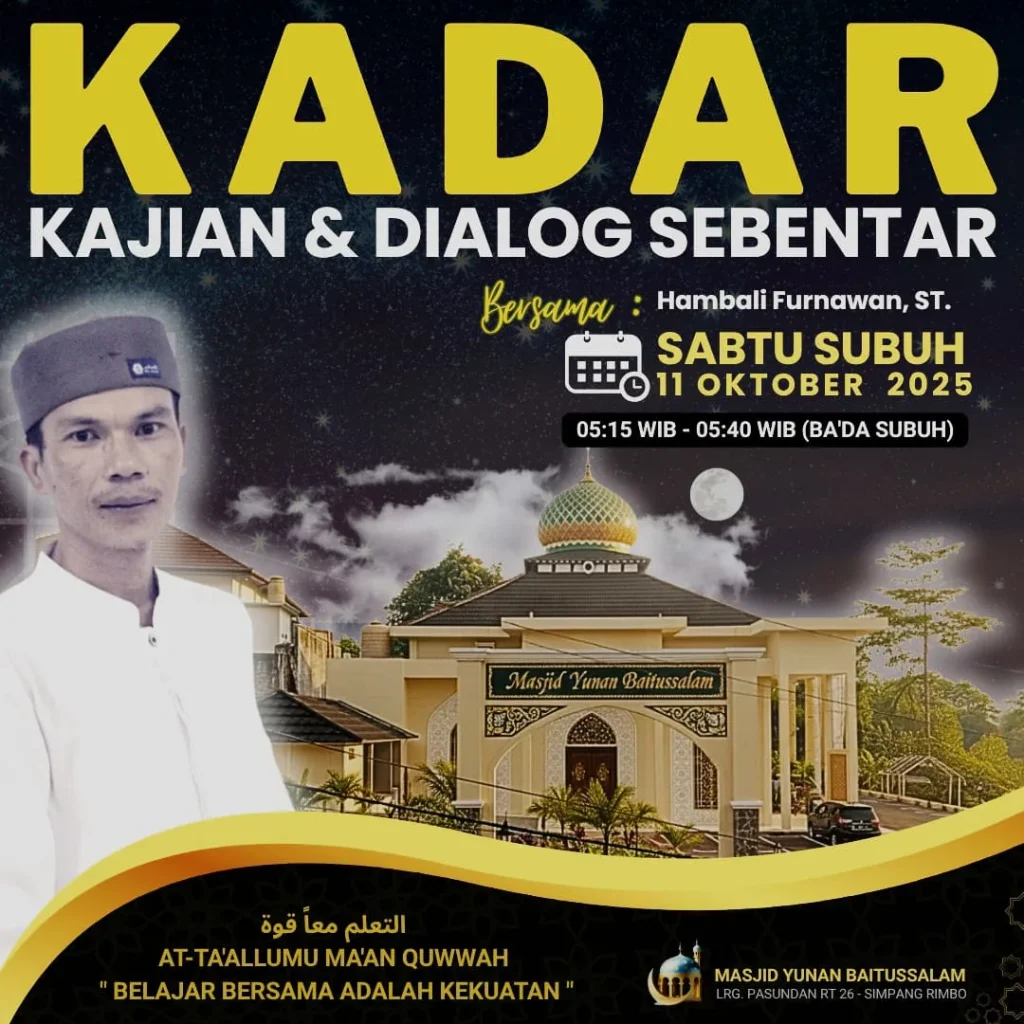 Kajian dan Dialog Sebentar (KADAR) Sabtu Subuh – Ba’da Sholat Subuh Berjama’ah, 11 Oktober 2025.